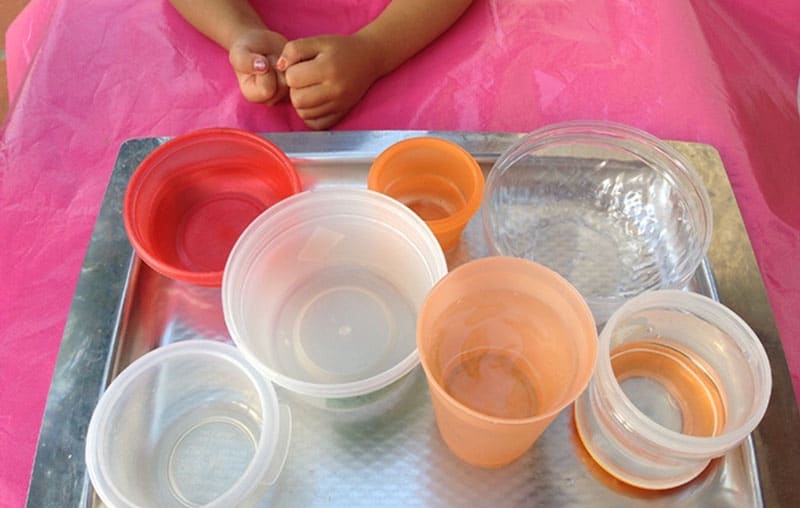 Se trata de hacer transvases de agua de un recipiente a otro. Podéis utilizar recipientes de plástico 🥛 que tengáis por la cocina de diferentes tamaños.