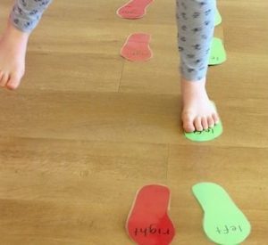 Entre las huellas, pondréis una o varias sillas, para que pasen por debajo o por encima, según el tamaño que tengan. Y luego… ¡A poner más huellas! Podéis ampliarlo con más obstáculos, según el espacio del que dispongáis en casa.
